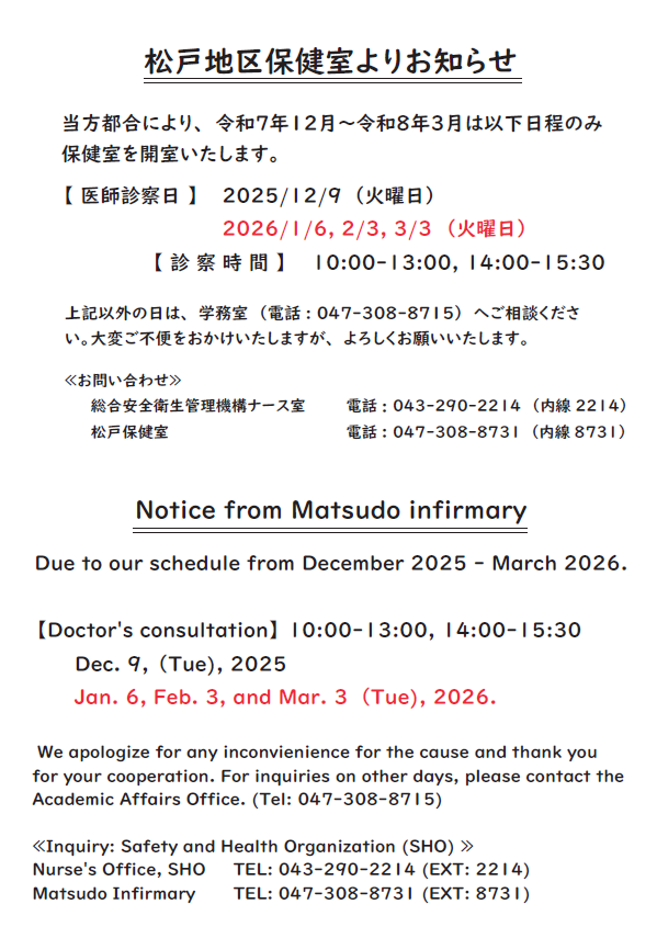 は保健室開室日(9:00〜13:00及び14:00〜16:00 看護師が在室しています)